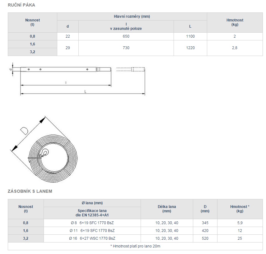 Lana jsou dodávána zvlášť, navinutá na zásobníku lan. Možnost výběru lan z délky 10, 20, 30 a 40m.